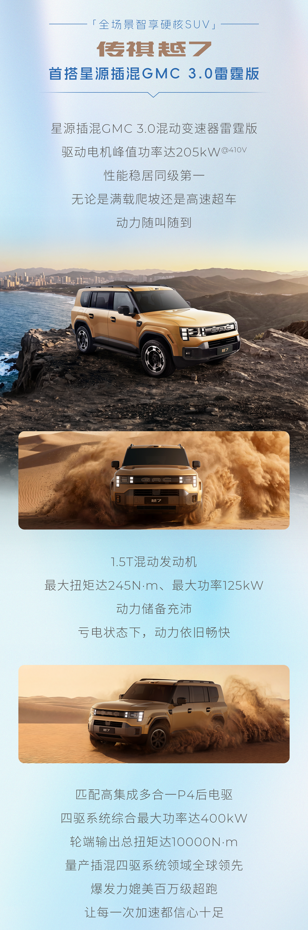 传祺越7搭载了星源插混GMC3.0雷霆版,具备205kW的驱动电机峰值功率和125kW的1.5T混动