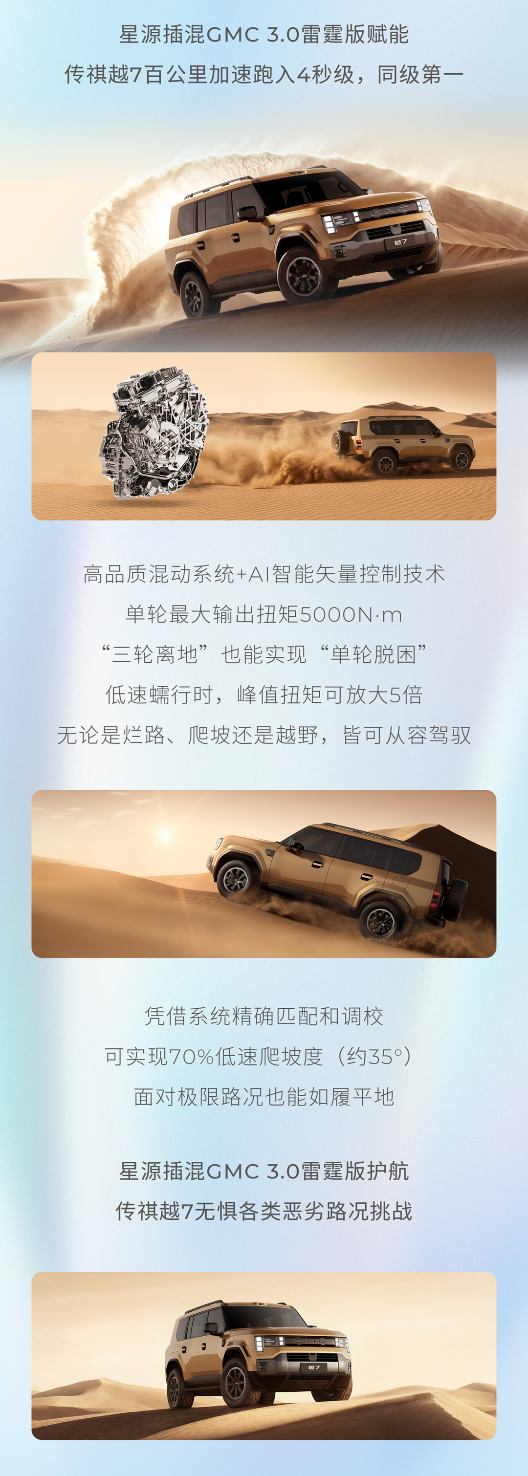 发动机最大功率,峰值扭矩达到245N·m。车辆匹配高集成多合一P4后电驱,四驱系统综合最大功率达到400kW,轮端输出总扭矩高达10000N·m,展现了强大的越野能力。在极端条件下,如“三轮离地”,越7仍能实现“单轮脱困”,低速蠕行时峰值扭矩可放大5倍,适应多种复杂路况。
