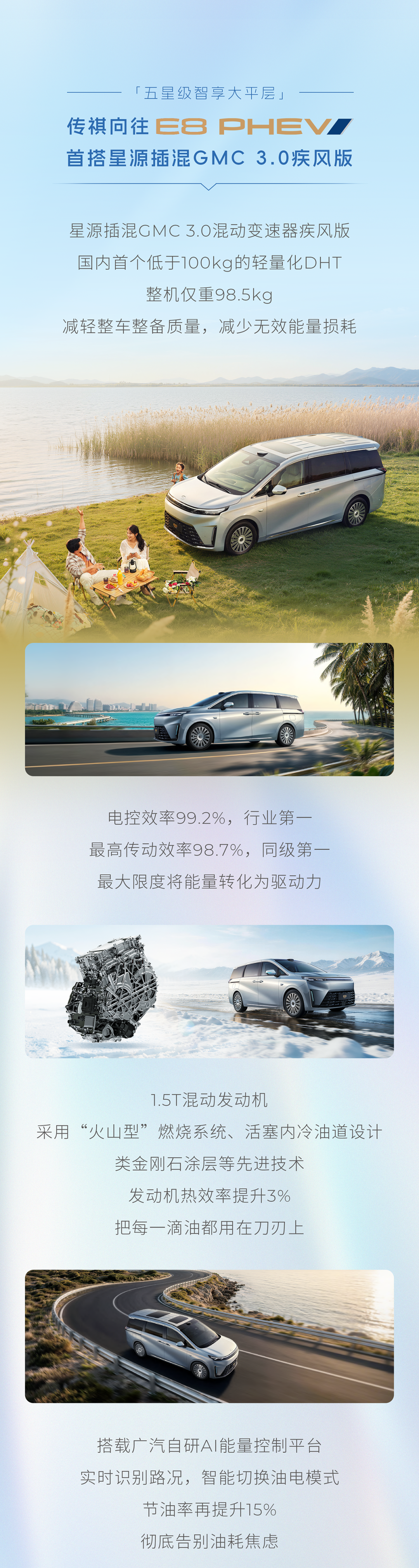 传祺向往E8PHEV则搭载了星源插混GMC3.0疾风版,匹配国内首个低于100kg的轻量化DHT,整机重量仅为98.5kg,电控效率高达99.2%,传动效率达到98.7%。新车采用1.5T混动发动机,通过“火山型”燃烧系统等技术提升发动机热效率3%,实现燃油经济性。同时,搭载广汽自研AI能量控制平台,智能识别路况并切换油电模式,节油率提升15%。向往E8PHEV的百公里亏电油耗为3.98升,纯电续航281km,综合续航达到1537km,官方称这些数据均为同级领先。